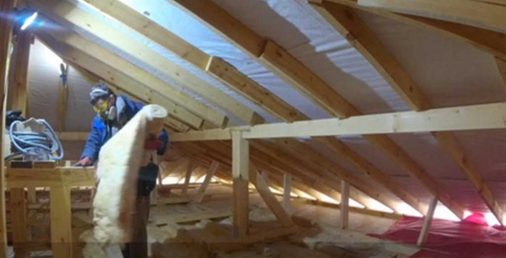 Более сложным вариантом является использование минеральной ваты. Ее нужно обязательно изолировать от сырости. Поэтому перед укладкой утеплителя прокладывают гидроизоляцию, помещая ее вплотную к кровле так, чтобы она огибала стропила. Далее укладывают минвату, затем все остальные элементы утепления.