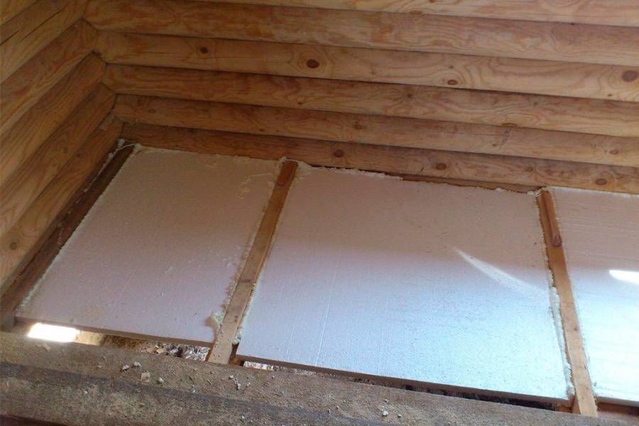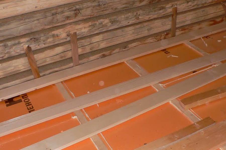В деревянных банях из бруса потолок утеплеяют со стороны чердачного помещения. Обшивка потолка проводится досками не меньше 6 см в толщину, на них укладывают слой пароизоляции из алюминиевой фольги, который сверху покрывают слоем мягкой глины. После чего укладывается утеплитель толщиной 15 см. Утеплителем может служить керамзит, песок, опилки, смешанные с глины). Поверх теплоизоляции наносится цементная стяжка в 3 см толщиной, а чтобы по чердаку можно было ходить, поверх стяжки настилают доски.