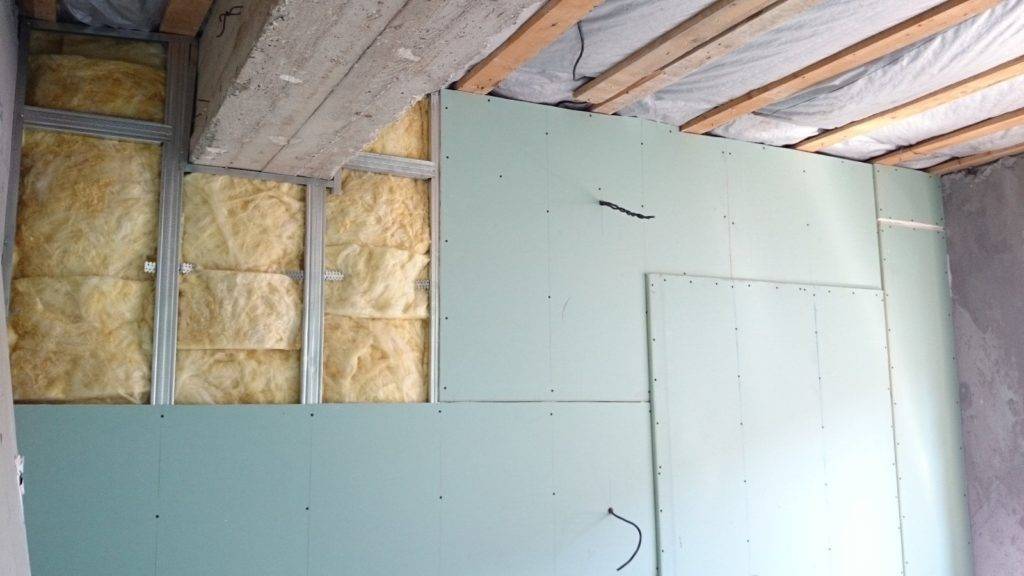 Можно выполнить работу по-другому. Сделать каркас. Одну его сторону обшить ЛГК. Обратную – упаковать листами минеральной ваты. Их все поочередно просовывают в полость под решетки, не делая пропусков. Любая неплотность в стыковке чревата образованием «мостиков холода». В случае если изоляция по толщине «не проходит» в зазор, ее отслаивают, убирая лишнюю толщину. Заполненный изоляцией каркас закрывается гипсокартонными листами.