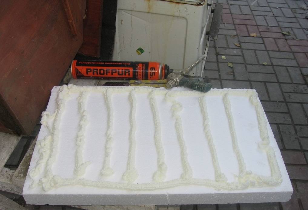 Выравнивать стены перед работой дорого, да и зачем это? Поэтому есть предложение не особо обращать внимание на то, как должно быть в идеале. Сделаем просто, надежно и быстро. Экспресс-метод утепления гаража пенопластом изнутри – наносим монтажную пену на листы утеплителя полосками с шагом в 5–10 см