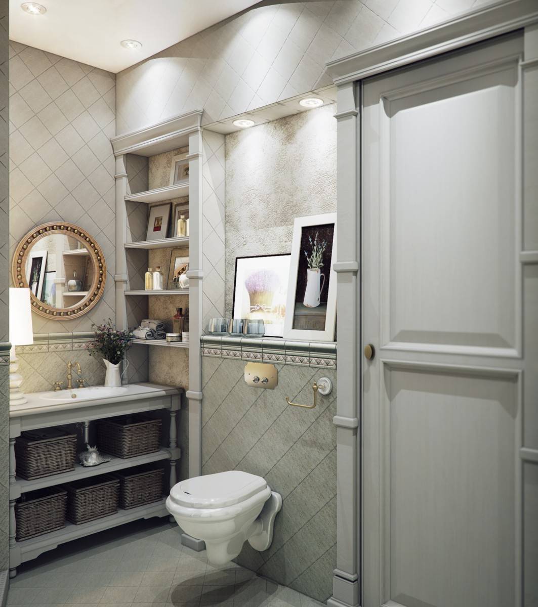 Выход здесь – в стилизации. Скажем, оформив комнату в нежных, светлых тонах мы уже сделаем шаг навстречу мечте, а, добавив буквально два-три соответствующих аксессуара: зеркало в старинной раме, короб из ивняка для грязного белья или кованые светильники, создадим вполне узнаваемый, яркий образ.