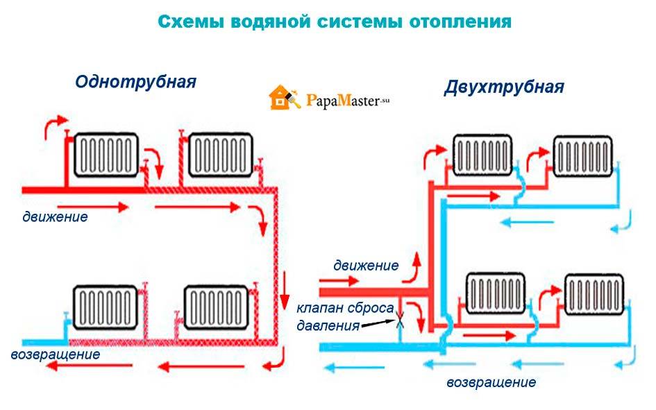 Слева — усовершенствованный вариант однотрубной схемы (аналог «ленинградки»), справа — двухтрубный вариант. Последний обеспечивает более комфортные условия, точное регулирование и даёт более широкие возможности по замене радиатора