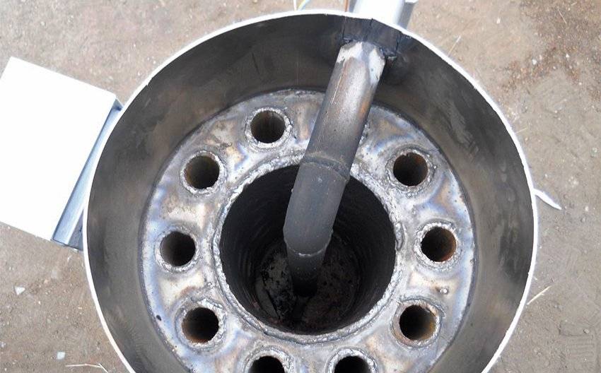 Для подачи кислорода используется труба длиной около 37 см и диаметром 100 мм. В ней по всей длине элемента выполняются отверстия, необходимые для поступления кислорода. Труба приваривается перпендикулярно крышке в нижней части аппарата. На ней фиксируется воздушная заслонка, которая будет крепиться с помощью заклепки или болтов. Отверстие под заслонкой должно быть размером 6 см. Оно предназначено для подачи масла и разжигания топлива.