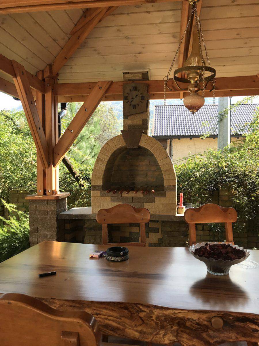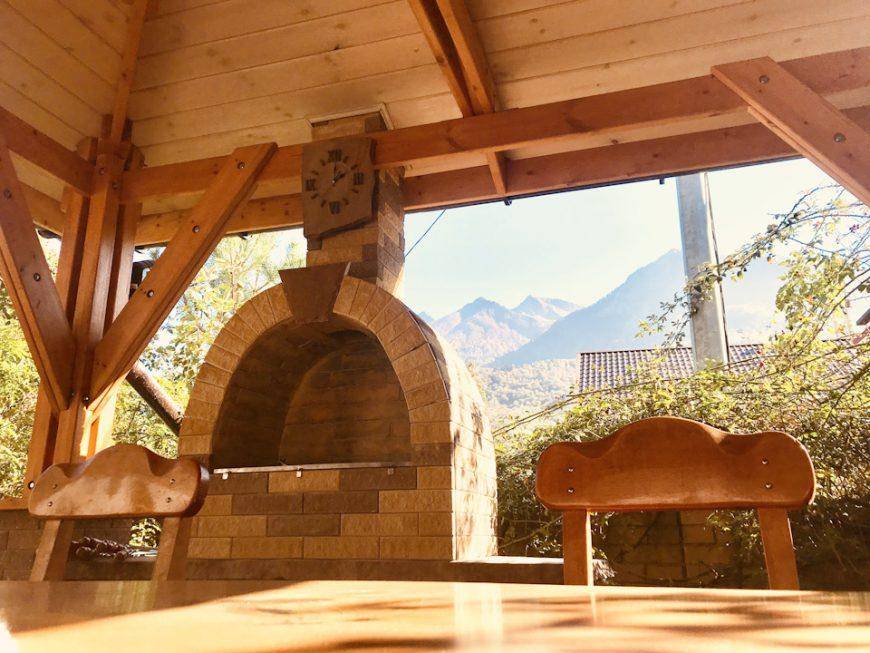 Если быть точнее, с мини-печью. Это сооружение позволяет готовить не только шашлык или гриль-овощи, но и делать кашу или блины. Стоит отметить, что строительство такой беседки довольно сложно и нуждается в руководстве специалистами.
