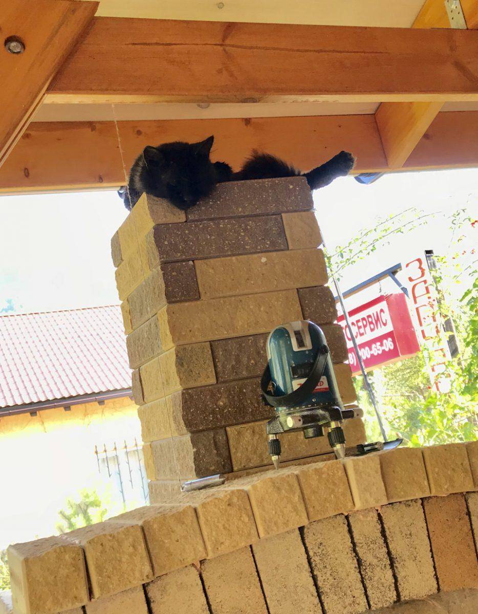 Трубы, выполняющие роль опорных стержней, также обкладываются кирпичами. Это и надежно, и выглядит отлично.