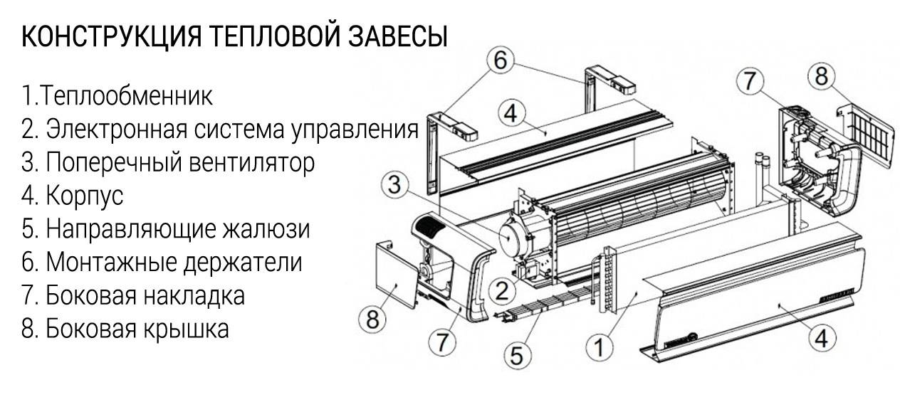 Турбина вентилятора размещается вдоль всего устройства – это обеспечивает эффективность и равномерную подачу горячего воздуха, который прокачивается по корпусу. Схема движения воздуха следующая: холодный воздух забирается у пола, продувается через нагревательный контур и выдаётся горячей струёй параллельно плоскости дверей или ворот.