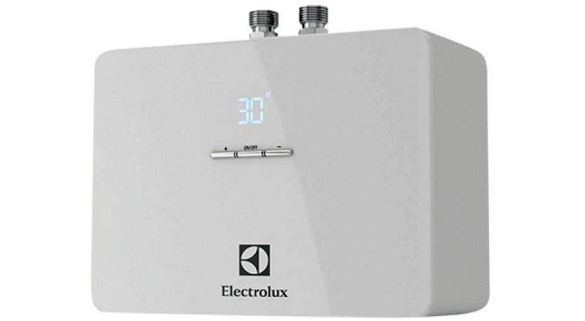 Небольшая горизонтальная модель (191x141x95 мм) с верхним подключением. Предназначена для закрепления на стене. Нагрев происходит спиральным элементом. Производительность 2,8 л/мин. Мощность 6 кВт. Можно подключать к нескольким смесителям (напорный). О включении прибора и о выполнении нагрева сообщает световой индикатор. Оснащен термометром и дисплеем. Управляется электронным способом. При достижении заданных параметров, отключается. Выключается при перегреве и при включении без воды. Выдерживает до 7 атм. Цена: 7600 рублей.
