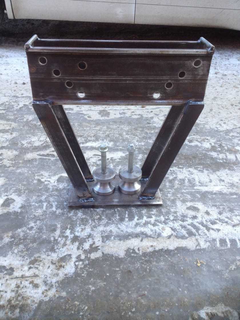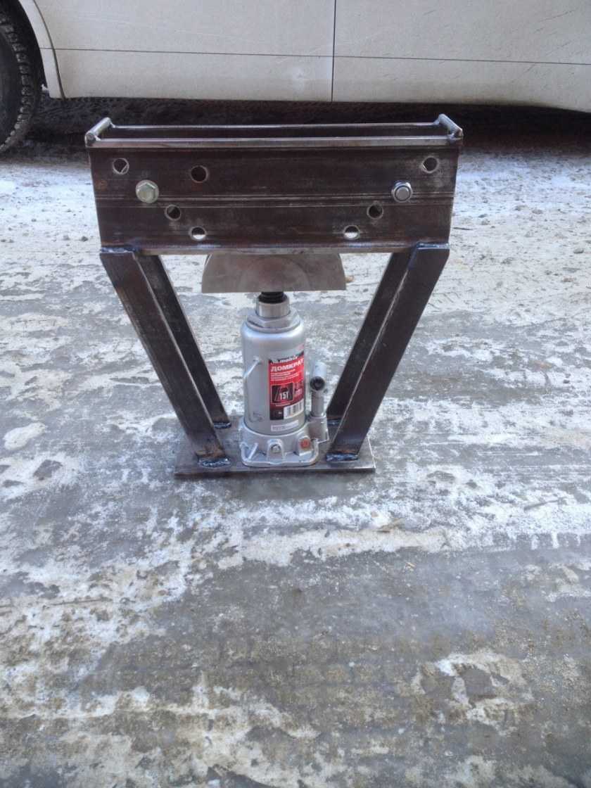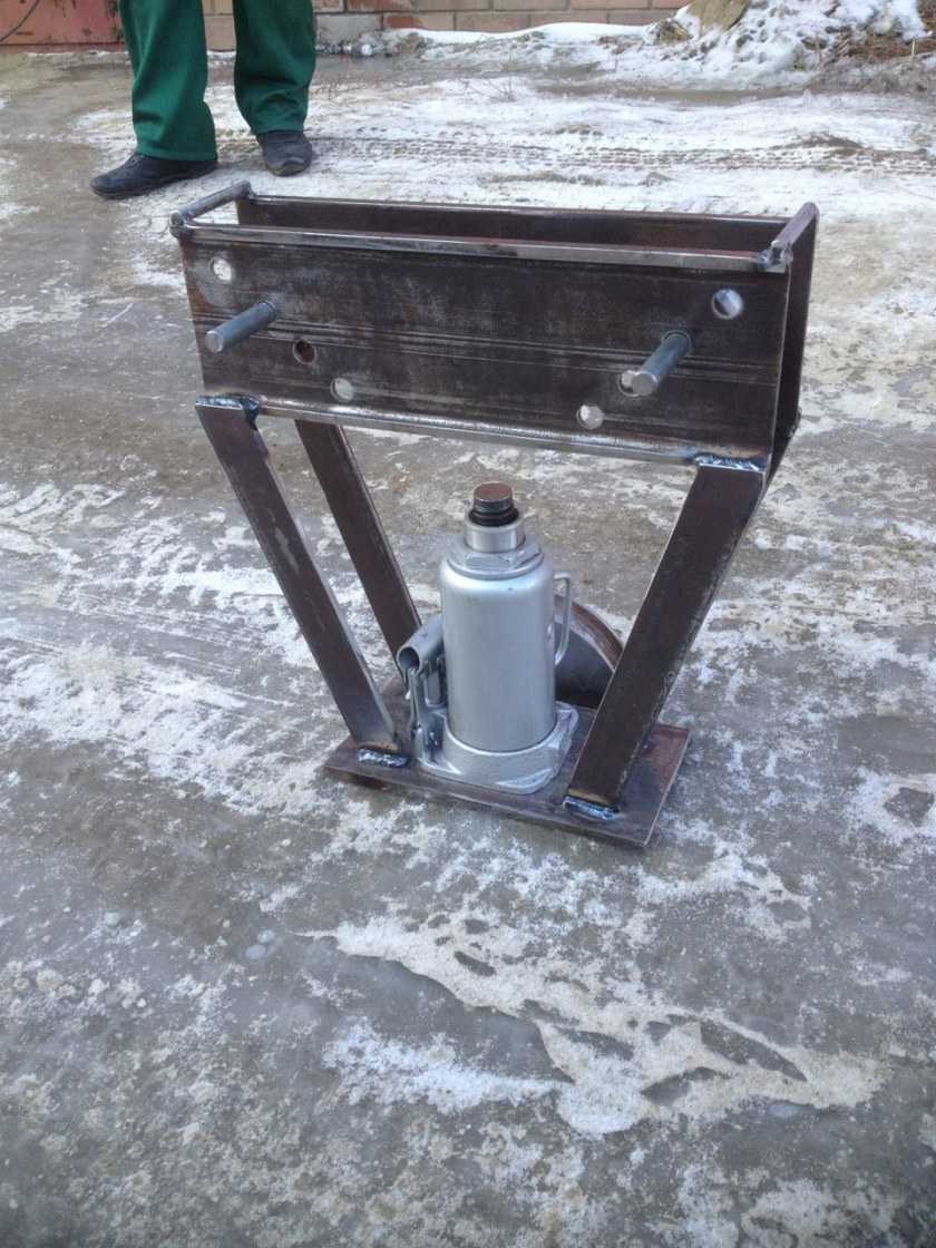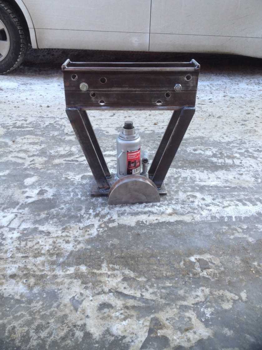 Работает на основе гидравлического привода, формирующего требуемое усилие. Подойдёт любой домкрат для автомобиля. Для монтажа рамы используются швеллеры. Гибка производится на двух упорах, смонтированных строго симметрично. Можно сделать инструмент с возможностью регулировки положения упоров.