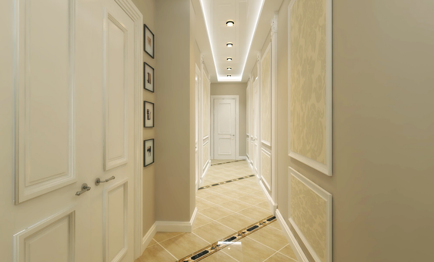 Если коридор узкий, следует разделить пространство путем выделения входной секции износостойкими материалами.