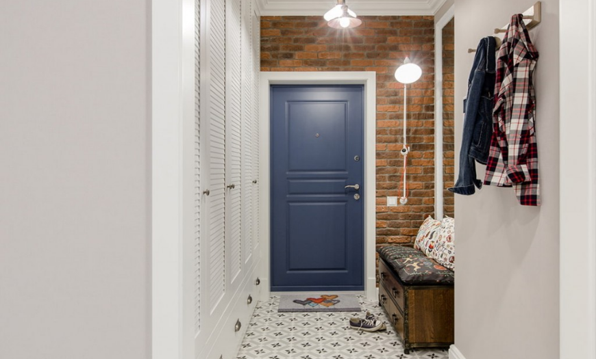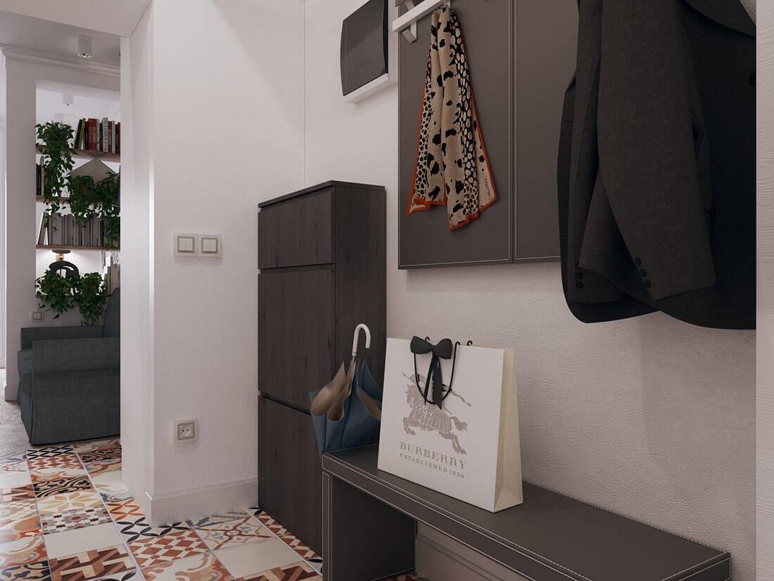 - Если приобретение мебели не входит в планы хозяев, можно обойтись навесными полками для хранения, под которыми возможно разместить крючки для верхней одежды;