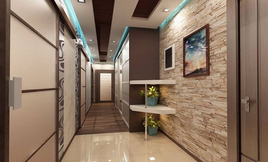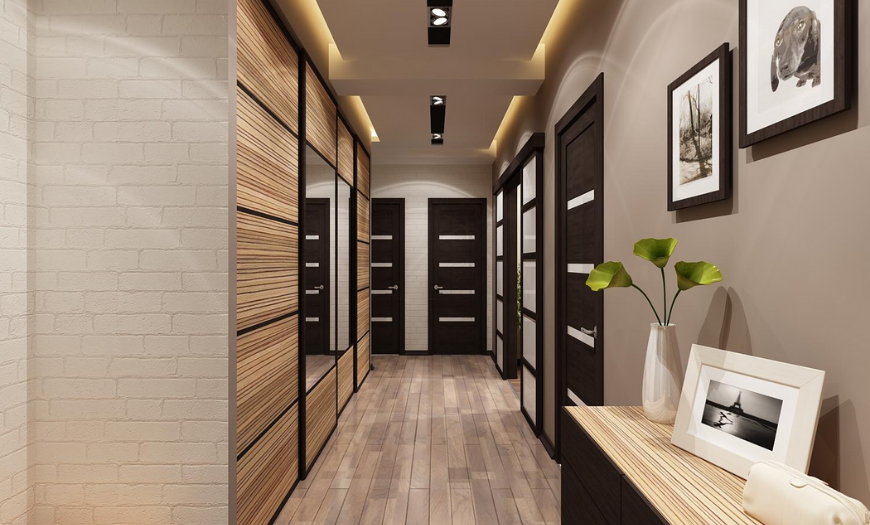 - Визуально увеличить коридор и сделать его более функциональным можно с помощью мебели до потолка со стеклянными фасадами;