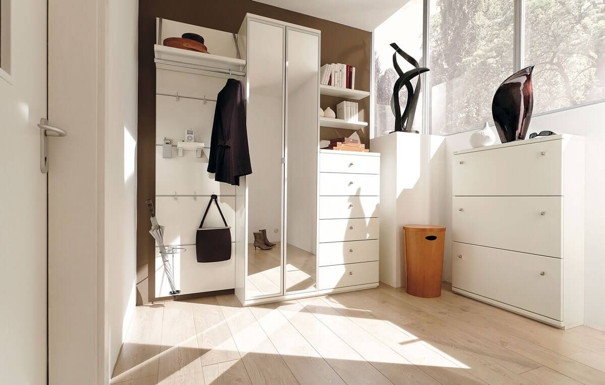 Обязательно стоит обустроить прихожую так, чтобы разместились: вешалки для одежды (открытые и закрытые), секции для хранения пар обуви, место для обувания с сиденьем, зеркало во весь рост.