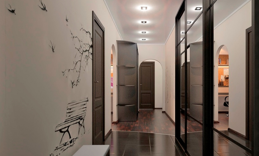 Чтобы сделать холл в двухкомнатной квартире более светлым, нужно увеличить величину дверных проемов или убрать часть стены, совместив одну комнату с другими.