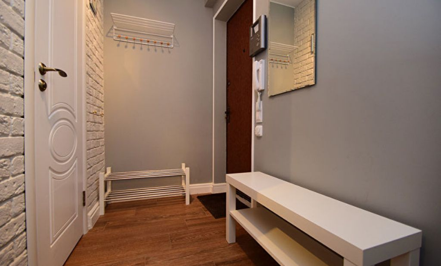 - За входной дверью два очень узких коридорчика сходятся под прямым углом. В углу треугольная скамья с местом для обуви, в этом же углу под потоком треугольный шкаф. Крючки для одежды на днище шкафа.