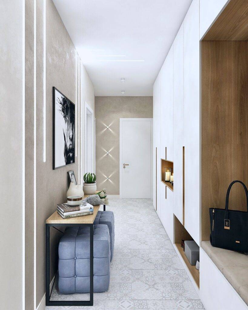 К необязательным предметам мебели для узкой прихожей относятся пуфики, скамьи, стеллажи, полки для книг, подставки для зонтов и напольные вешалки. Эти предметы повышают удобство использования помещения, но сильно загромождают пространство. В узкой прихожей без них можно обойтись.