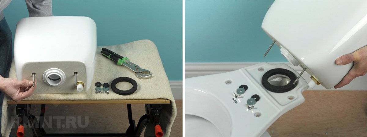 С помощью двух крепежных элементов бачок надежно крепится к унитазу. Снизу чаши на винты закручиваются гайки-барашки, предварительно надеваются тоненькие прокладки