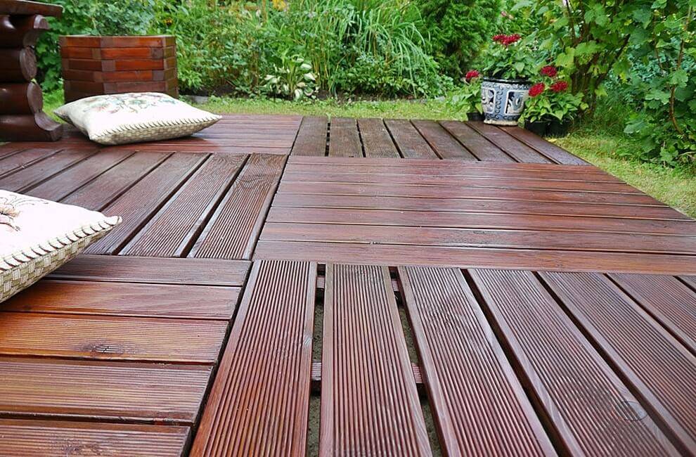 - Паркет садовый. Выглядит как двухслойная плитка размером 300 на 300 мм. Стандартная толщина – в пределах от 20 до 50 мм. Подложка из пластика – это первый слой, место второго занимают дощечки из ДПК, соединённые с основой с помощью шурупов. Паркет нельзя крепить к основанию, им просто накрывают пол для летнего отдыха. Потом конструкцию легко убрать. Даже планкен из аналогичных основ не может похвастаться такими свойствами.