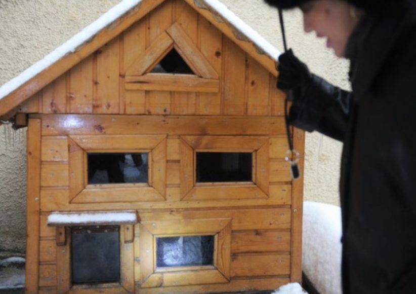 — Мне на заказ изготовили один домик из фанеры, другой из пенопласта со специальной обивкой (как у кухонных гарнитуров) и ещё один из дерева. Внутрь стелю тёплые вещи, пелёнку впитывающую и обязательно синтепон или холлофайбер. Все домики укутаны коврами, куртками, шубами и завернуты в полиэтилен. Кормлю на куске пенопласта из лоточков пенопластовых (после магазинных куриных окорочков остаются).