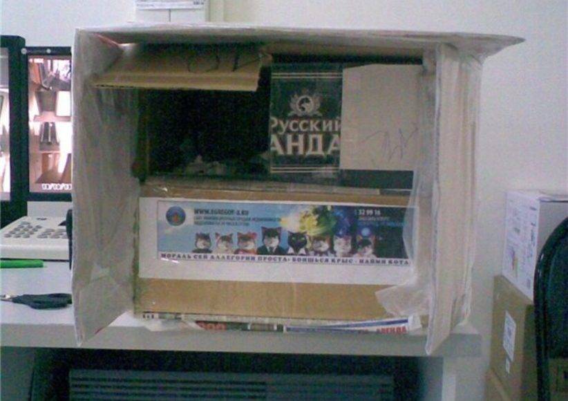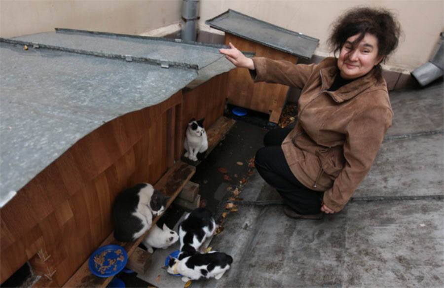— У одной из станций московского метро добрые люди соорудили для кошек домик. Там большая картонная коробка, накрытая плотным полиэтиленом, в ней стоит коробка поменьше — получается перед маленькой коробкой навес, где стоят миски. Вход закрыт шерстяным одеялом старым, внутри тряпки и бумаги.